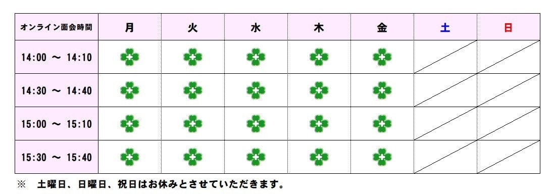 ・実施予定日(月曜日~金曜日)及び時間割(4枠です)は下表の通りとなっており各10分間でございます